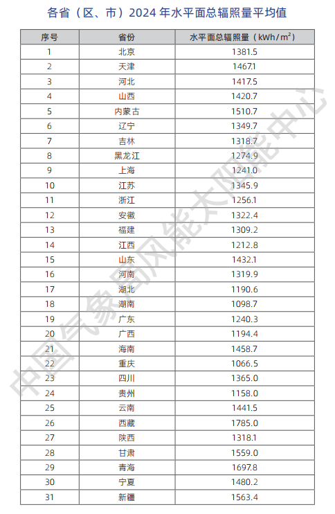 根据我国太阳能资源总量等级划分标准《太阳能资源等级 总辐射》(GB/T 31155-2014)1, 2024 年,西藏大部、青海中北部、四川西部等地年水平面总辐照量超过 1750kWh/m2 , 为太阳能资源最丰富区; 新疆、西藏东部、内蒙古大部、西北地区中西部、华北大部、西 南地区西部、华东北部等地年水平面总辐照量 1400kWh/m2 至 1750kWh/m2 ,为太阳能资 源很丰富区;东北大部、西北地区东部、华中、华东中南部、华南等地年水平面总辐照量1050kWh/m2 至 1400kWh/m2 ,为太阳能资源丰富区;西南地区东部、华中西部等地全国年 水平面总辐照量小于 1050kWh/m2,为太阳能资源一般区。