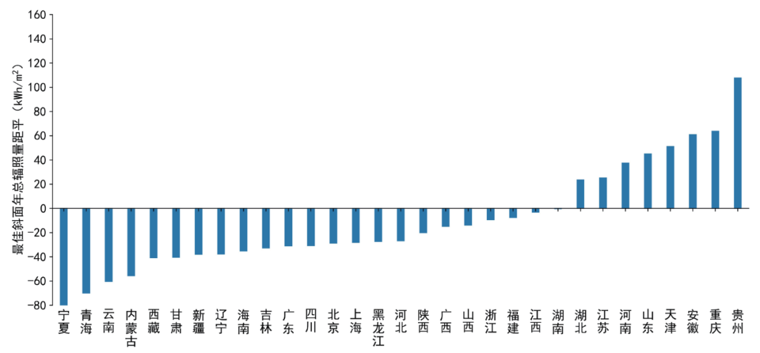 从各省(区、市) 分布(图 2.9)来看,宁夏、西藏、青海、云南、内蒙古、甘肃和新疆 最佳斜面年总辐照量较近 30 年均值明显偏小;海南、辽宁、四川、陕西、北京、上海、黑龙江、 河北偏小;湖北、江苏偏大;河南、山东、重庆、安徽、天津明显偏大;贵州异常偏大。