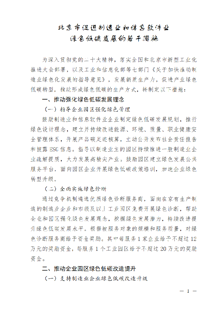 为贯彻落实全国和北京市新型工业化推进大会精神,发展新质生产力,大力推进产业绿色低碳转型,培育产业绿色发展新动能,北京市经济和信息化局制定了《北京市促进制造业和信息软件业绿色低碳发展的若干措施》,现印发给你们,请积极推动实施。