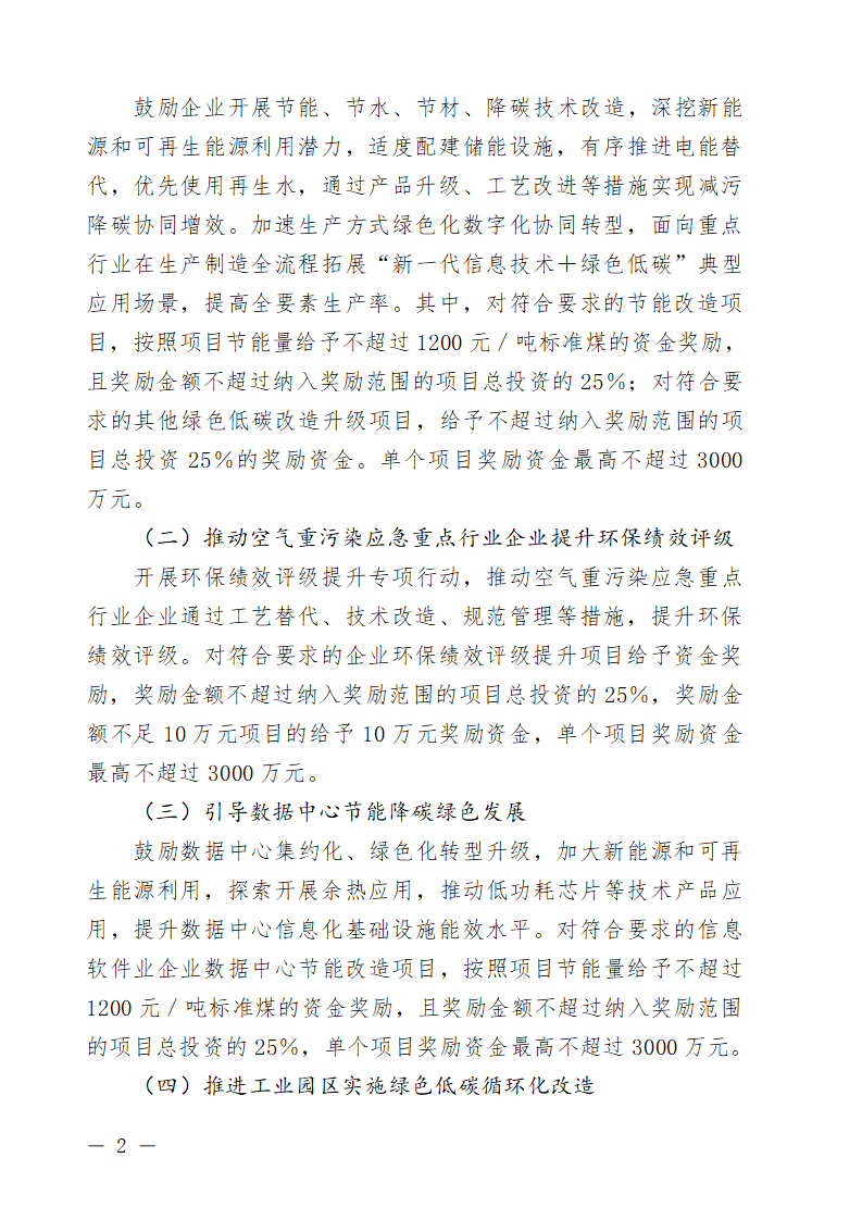 同时,对符合要求的其他绿色低碳改造升级项目,给予不超过纳入奖励范围的项目总投资25%的奖励资金。单个项目奖励资金最高不超过3000万元。