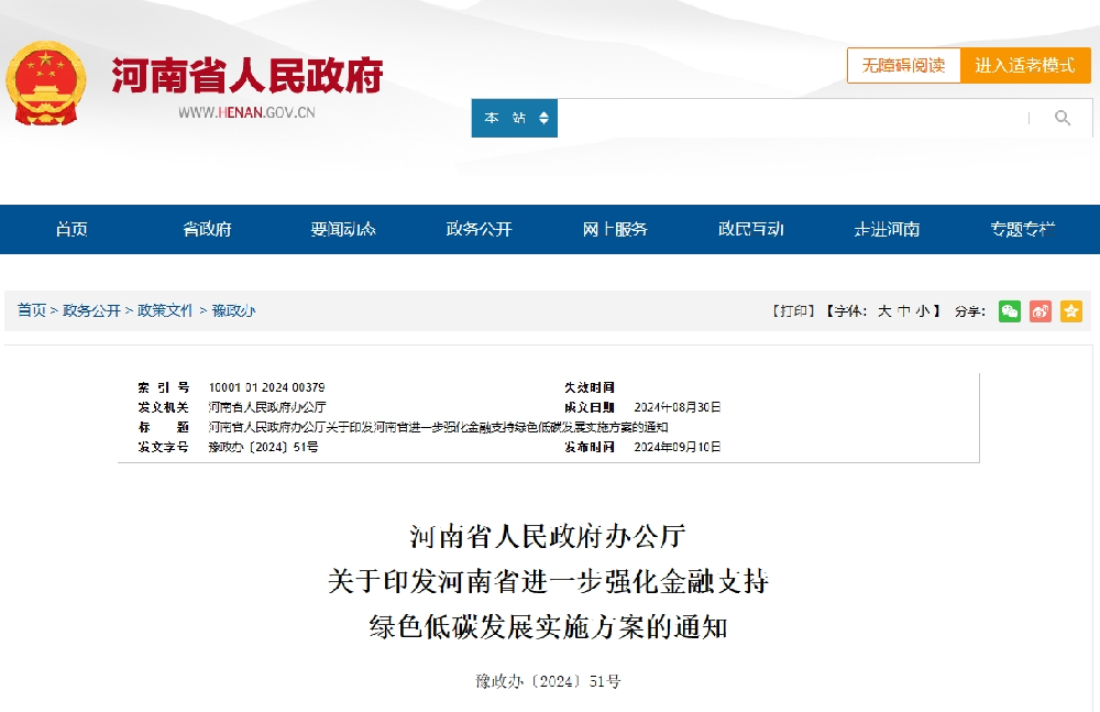 河南印发进一步强化金融支持绿色低碳发展实施方案