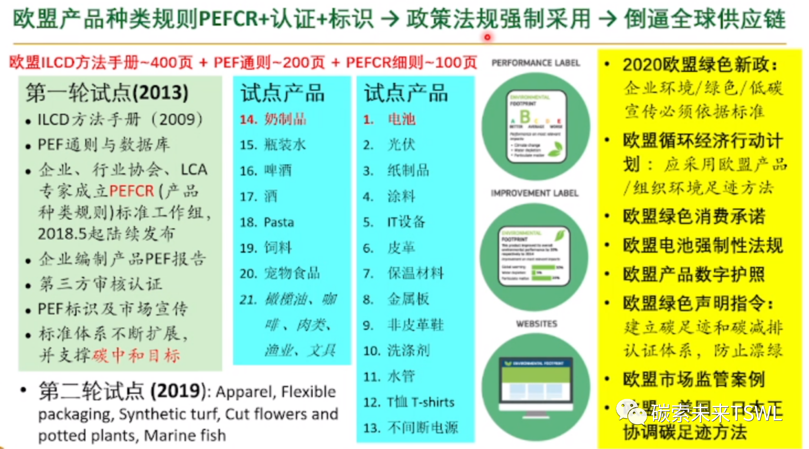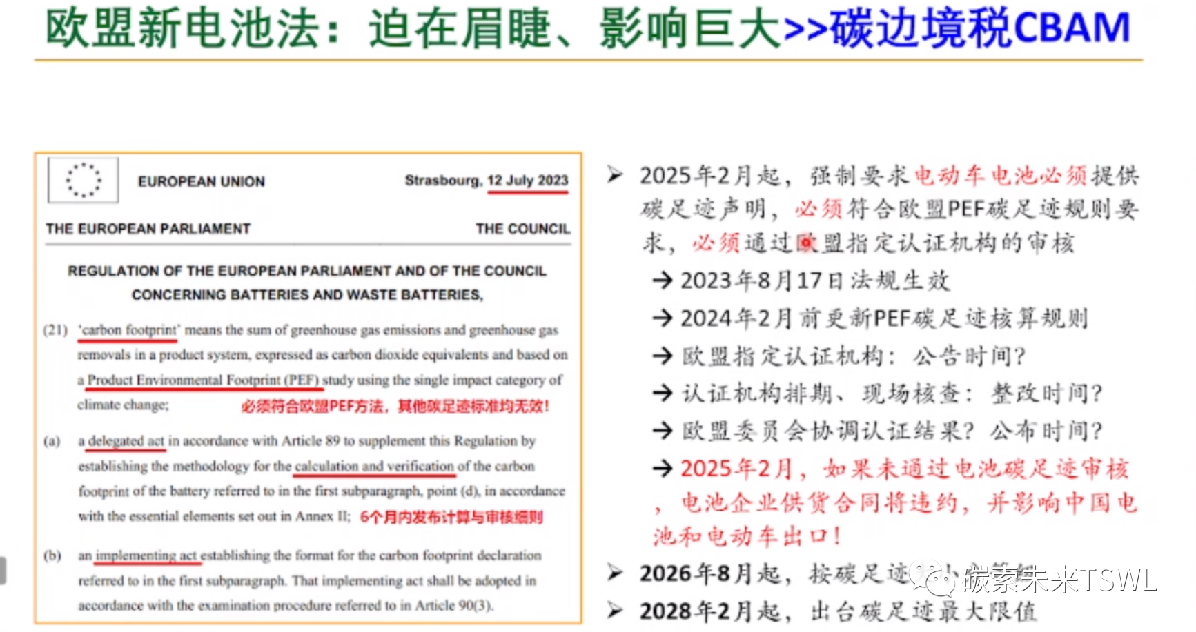 产品环境足迹(PEF)是欧盟提出的一种计算产品总体环境影响的方法学。根据《新电池法规》,出口欧盟市场的电池和电动汽车,必须要完成符合欧盟PEF标准的电池碳足迹认证。产品碳足迹正在成为国际贸易壁垒的关键之一,欧盟PEF有可能渗透到全球产业链,逐步成为碳足迹全球标准。
