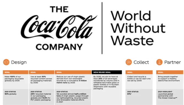 可持续发展对于拥有百年历史的可口可乐品牌而言并非新概念,其历史可追溯至百多年前。然而,可口可乐公司开始搭建其现代意义上的可持续战略是在2018年,公司正式推出了名为「World Without Waste」的可持续战略,致力于推动包装领域的循环经济变革,聚焦于“设计(Design)”、“收集(Collect)”和“合作(Partner)”三大关键领域[3]: