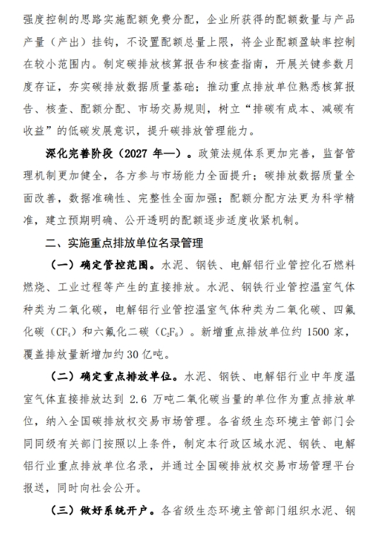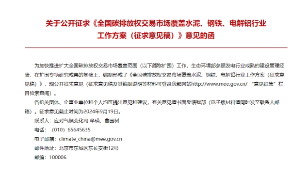 9月9日,生态环境部发布关于公开征求《全国碳排放权交易市场覆盖水泥、钢铁、电解铝行业工作方案(征求意见稿)》意见的函,《方案》中调到分两个阶段做好水泥、钢铁、电解铝行业纳入全国碳排放权交易市场相关工作,实现积极稳妥有序扩大全国碳排放权交易市场覆盖范围,2024—2026 年为启动实施阶段,2027年后为深化完善阶段。