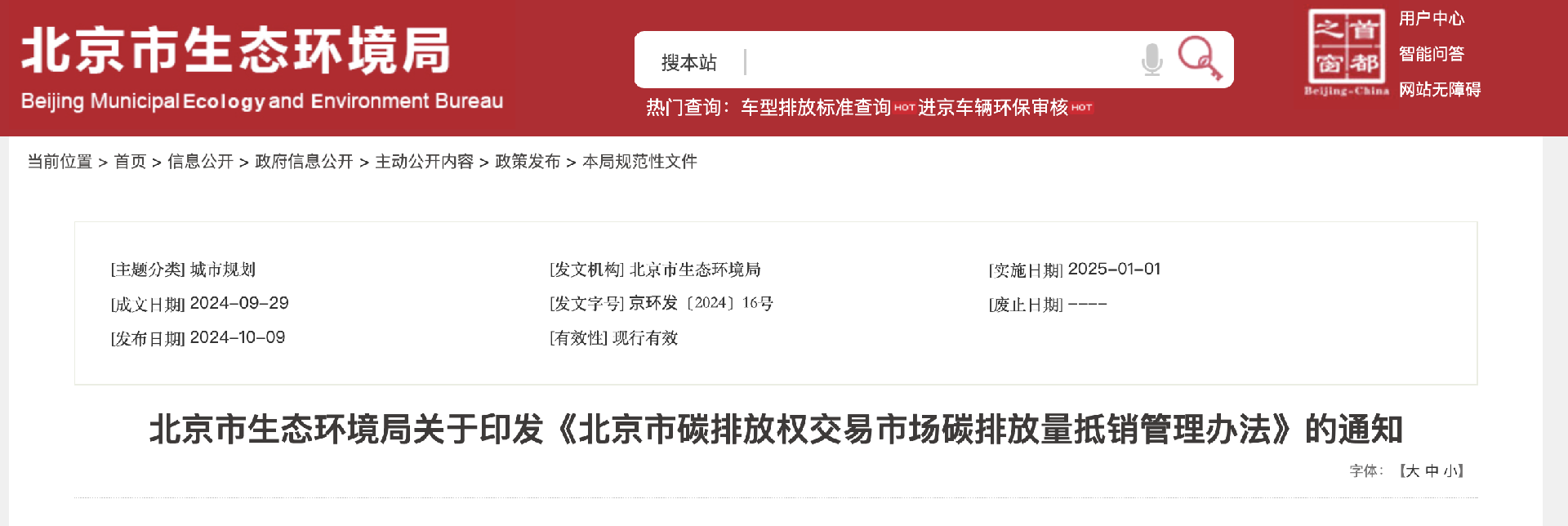 为规范北京市碳排放权交易市场碳排放量抵销工作,落实《北京市碳排放权交易管理办法》(京政发〔2024〕6号)(以下简称《管理办法》),北京市生态环境局印发《北京市碳排放权交易市场碳排放量抵销管理办法》(以下简称《抵销管理办法》)。