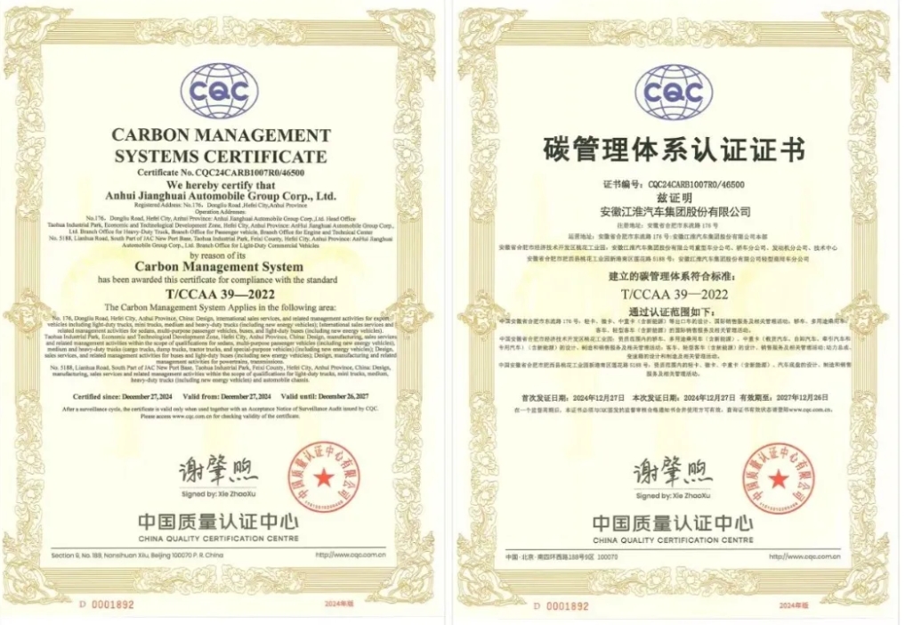 日前,中国认证认可协会《碳管理体系 要求》团体标准应用试点工作再传捷报。江汽集团荣获中国质量认证中心(CQC)颁发的碳管理体系认证证书,成为汽车行业首家获此殊荣的企业。