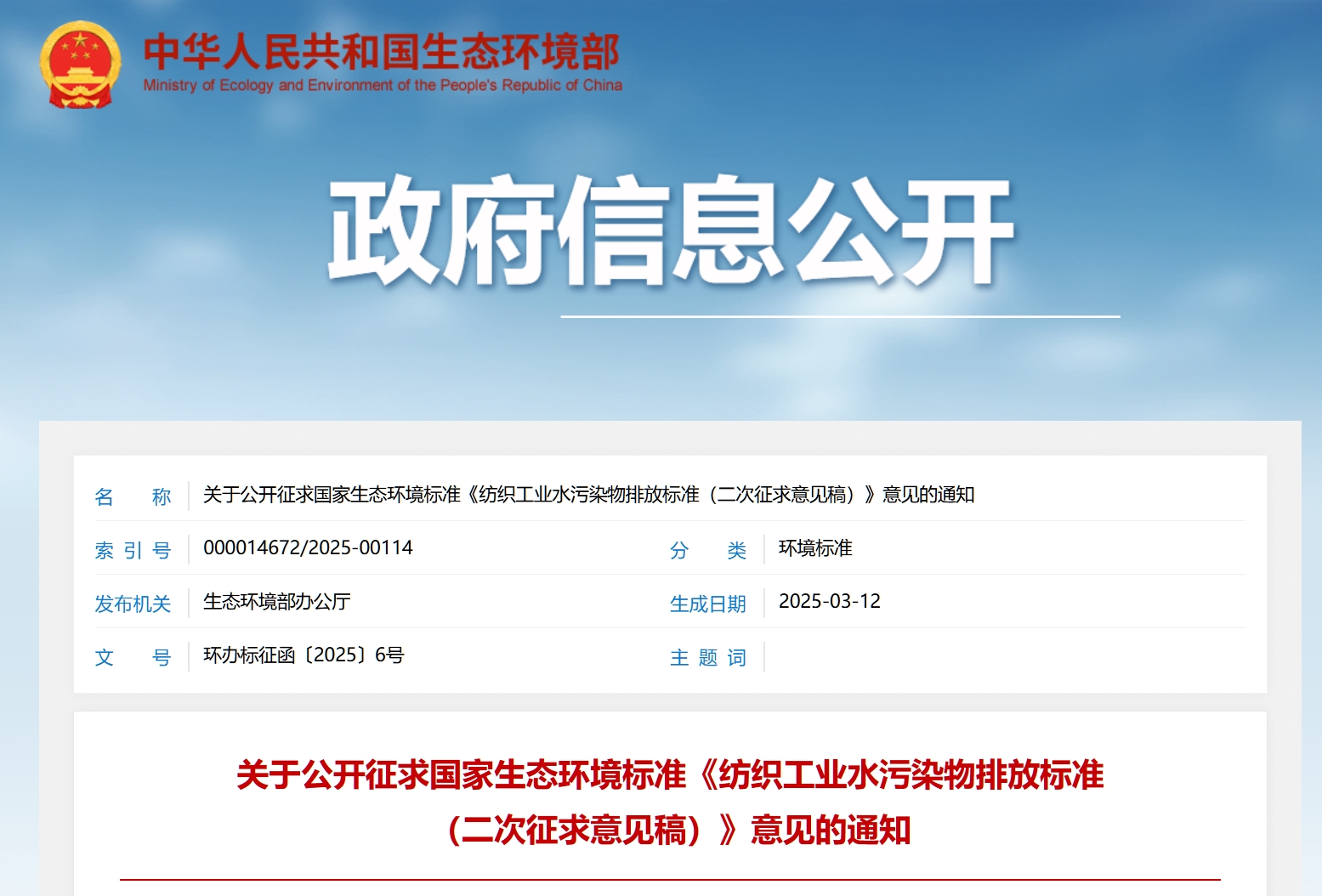 关于公开征求国家生态环境标准《纺织工业水污染物排放标准(二次征求意见稿)》意见的通知