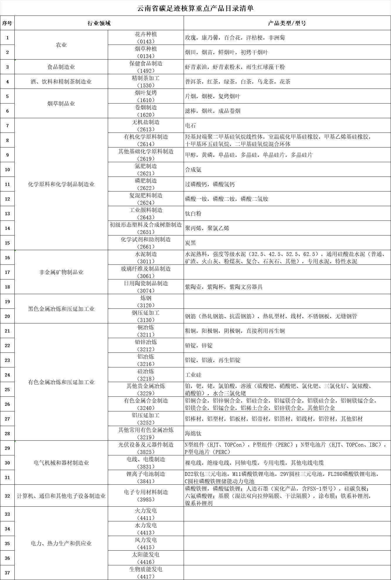 为加快提升我省重点产品碳足迹管理水平,促进相关行业绿色低碳转型,省级有关部门优先聚焦我省优势产业、传统特色产业和出口导向型特征明显的重点行业重点产品,研究制定了《云南省碳足迹核算重点产品目录清单》,并结合国家碳足迹管理有关工作情况实行动态更新。现印发给你们,引导鼓励并支持各市场主体积极参与碳足迹数据报送、规则制定、标志认证、国际交流等工作,为云南省重点产品碳足迹管理建言献策。
