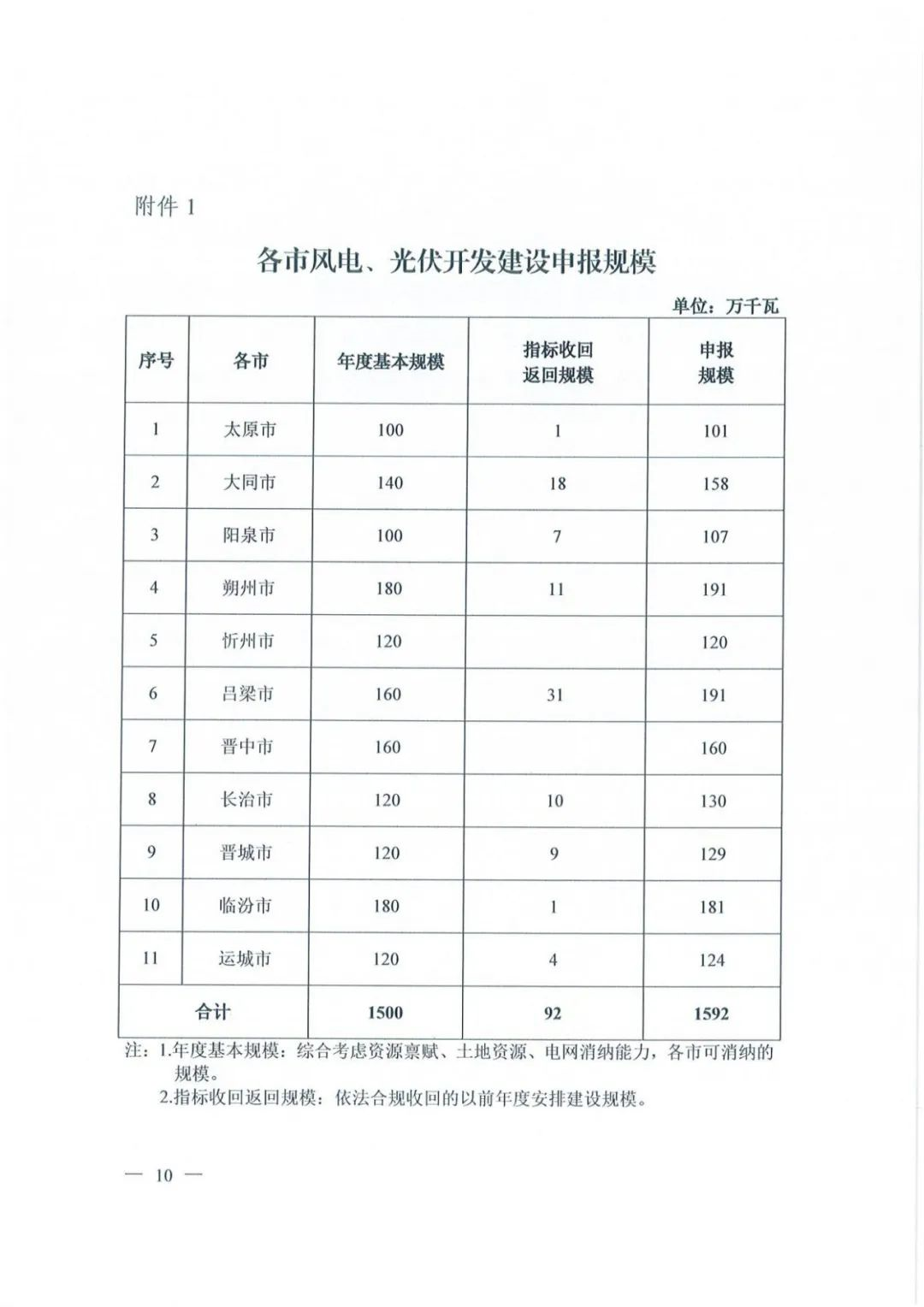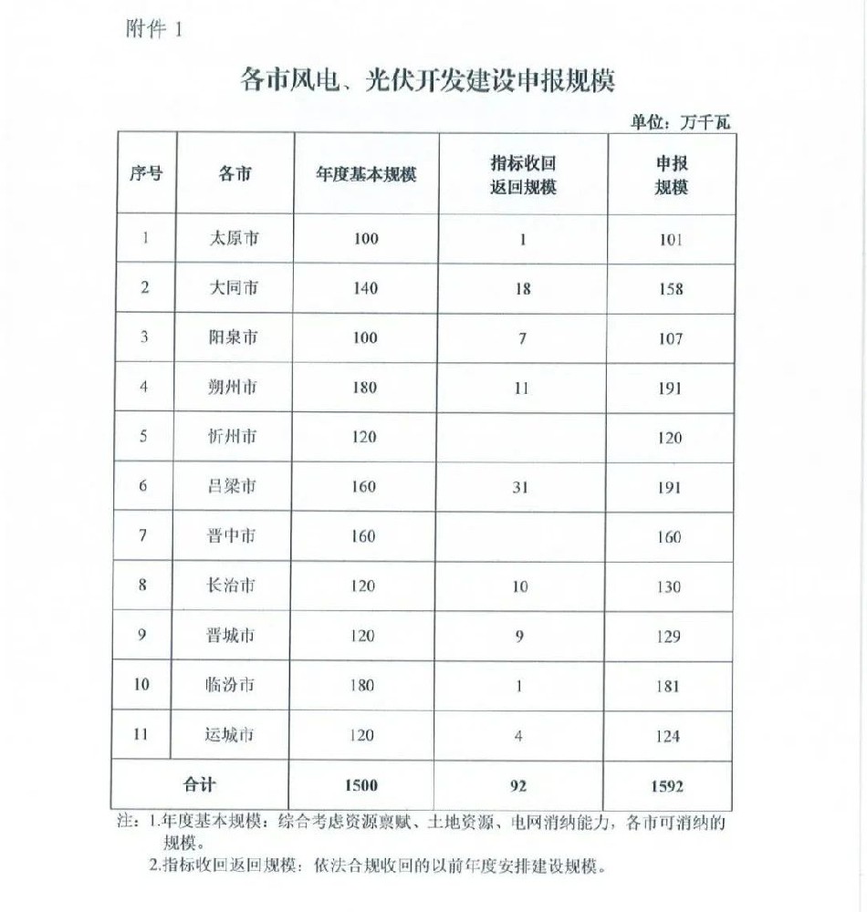 本次优选拟拟安排风电、光伏保障性并网规模1500万千瓦,返回规模92万千瓦,合计1592万千瓦。晋北采煤沉陷区6GW新能源基地涉及的6区县不再布局省内自用保障性并网光伏发电项目,但其土地资源优先保障晋北新能源基地光伏发电项目。各市风电、光伏开发建设申报规模如下表: