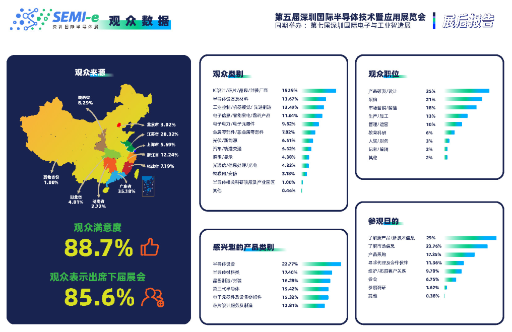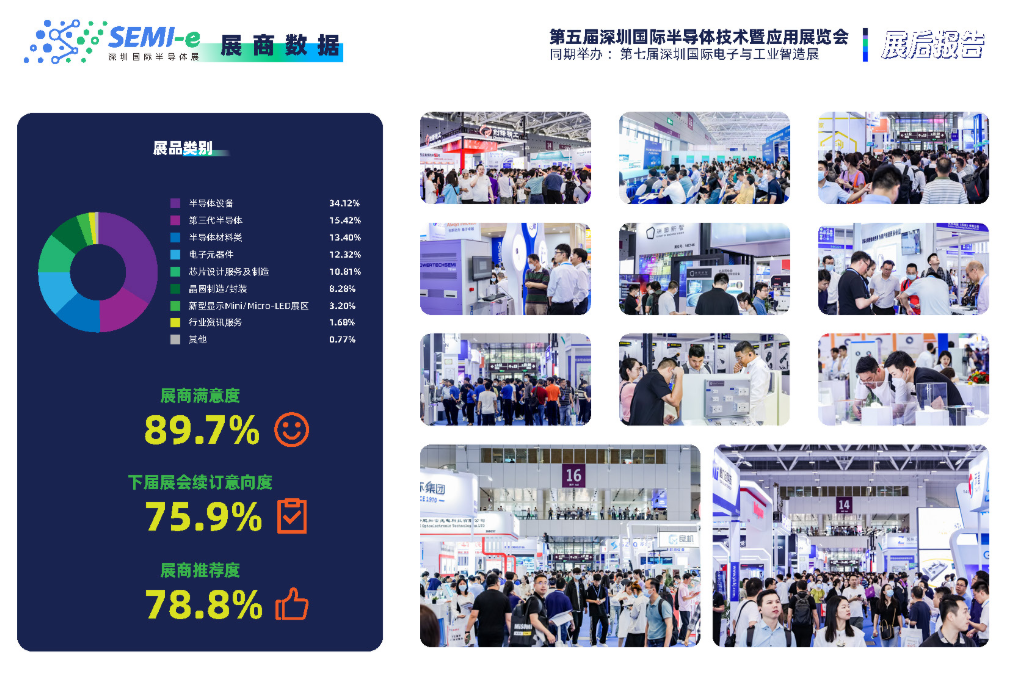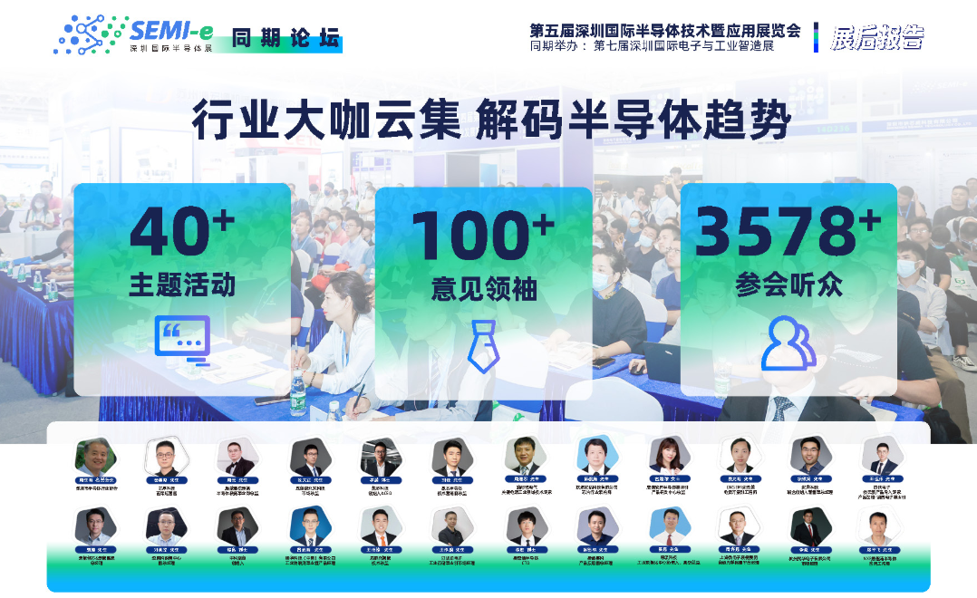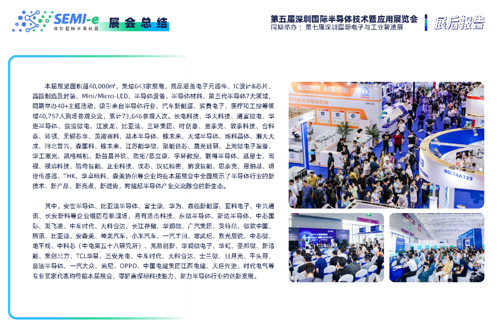 上届SEMI-e展览面积超40,000㎡,集结643家展商,展品涵盖电子元器件、IC设计&芯片、晶圆制造及封装、Mini/Micro-LED、半导体设备、半导体材料、第三代半导体7大领域,同期举办40+主题活动,吸引来自半导体行业、汽车新能源、消费电子、医疗和工控等领域40,757人到场参观交流,累计73,646参观人次。长电科技、华天科技、通富微电、华进半导体、捷捷微电、江波龙、比亚迪、三环集团、时创意、金泰克、敦泰科技、合科泰、沛顿、无锡芯享、英诺赛科、基本半导体、镓未来、天域半导体、烁科晶体、瀚天天成、河北普兴、森国科、镓未来、江苏能华微、聚能创芯、晟光硅研、上海微电子装备、华工激光、凯格精机、新益昌开玖、劲拓/思立康、宇环数控、联得半导体、基恩士、高视、视清科技、猎奇智能、正业科技、埃芯、汉虹精密、纳设智能、思泰克、恩纳基、明治传感器、THK、华卓精科、森美协尔等企业均在本届展会中全面展示了半导体行业的新技术、新产品、新亮点、新趋势,构建起半导体产业交流融合的新生态。