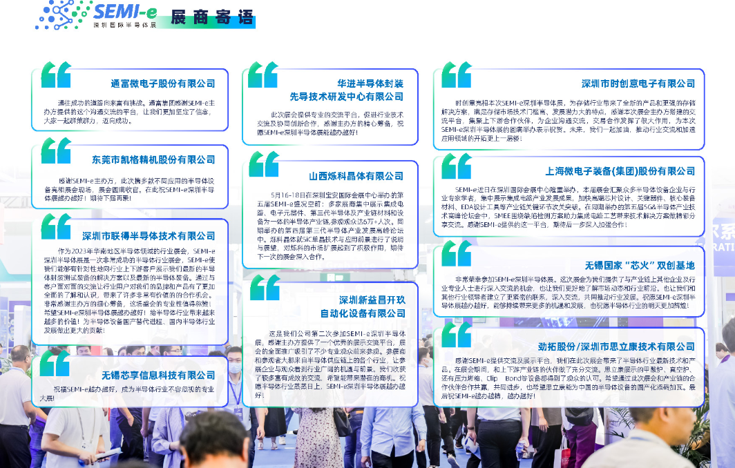 其中,安世半导体、比亚迪半导体、富士康、华为、嘉德新能源、亚科电子、中兴通讯、长安新科等企业组团莅临现场,另有扬杰科技、东微半导体、斯达半导体、中芯国际、英飞凌、中车时代、天科合达、长江存储、华润微、广汽集团、英特尔、微软中国、腾讯、比亚迪、安森美、神龙汽车、小米汽车、一汽丰田、寒武纪、紫光展锐、中芯微、地平线、中科芯(中电第五十八研究所)、兆易创新、华润微电子、华虹、圣邦微、新洁能、集创北方、TCL华星、三安光电、中车时代、天科合达、士兰微、日月光、平头哥、意法半导体、一汽大众、索尼、OPPO、中国电建集团江西电建、天岳先进、时代电气等专业买家代表均莅临本届展会,零距离探秘科技魅力,助力半导体行业的创新发展。