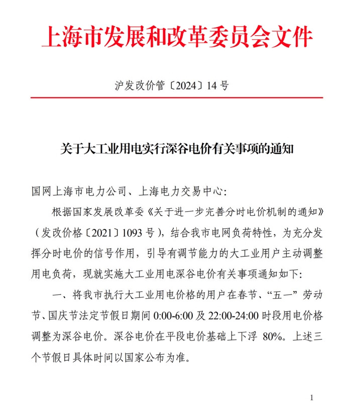 一、将我市执行大工业用电价格的用户在春节、“五一”劳动节、国庆节法定节假日期间0:00-6:00及22:00-24:00时段用电价格调整为深谷电价。深谷电价在平段电价基础上下浮80%。上述三个节假日具体时间以国家公布为准。