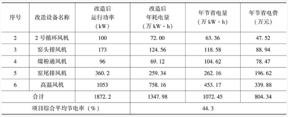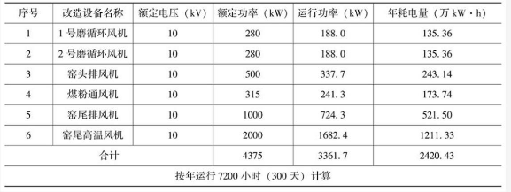 主要用能设备1号磨循环风机、2号循环风机、窑尾排风机、窑头排风机、煤粉通风机、窑尾高温风机等高低压电动机,年耗电量2420.43万kW·h,按年运行7200小时(300天)计算。