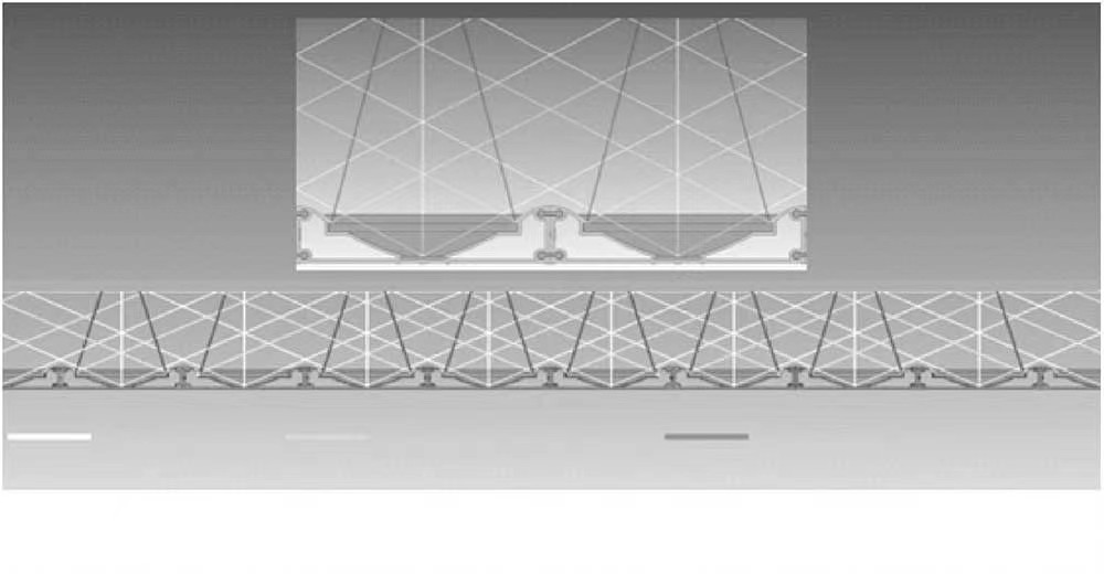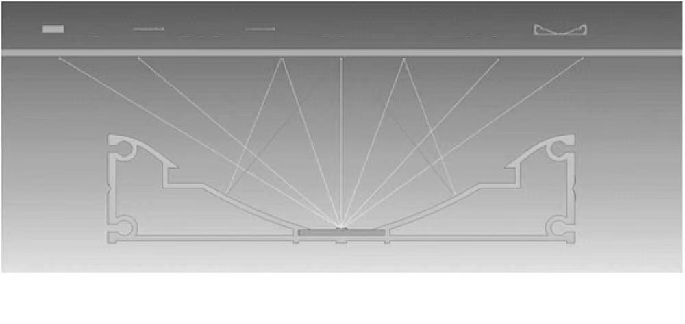 利用二次反射理论,将散热器型材作为光反射板,对匀光板(奶白板)反射回来的光进行二次反射,奶白板的一次透光率为55%,通过反射器进行二次反射后,奶白板的整体透光率可达到85%,光源系统光线反射图示如图3、4。