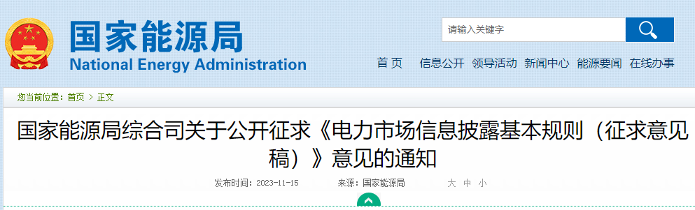 为贯彻落实党中央、国务院进一步深化电力体制改革、加快建设全国统一大市场的有关精神,统一全国电力市场信息披露机制,加强和规范信息披露工作,进一步满足市场经营主体信息需求,维护市场经营主体合法权益,国家能源局组织起草了《电力市场信息披露基本规则(征求意见稿)》,现向社会公开征求意见。