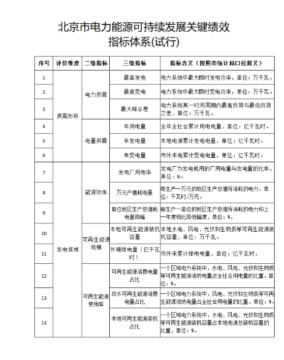为深入推进本市电力供应绿色低碳高质量发展,根据市市政设施规划建设运行联席会议办公室有关工作要求,我委会同市发展改革委、市生态环境局、华北能源监管局及国网北京市电力公司研究形成了《北京市电力能源可持续发展关键绩效指标体系(试行)》,现印发给你们,请遵照执行。我委将按年度统计发布本市电力供应环境可持续性关键绩效指标情况。
