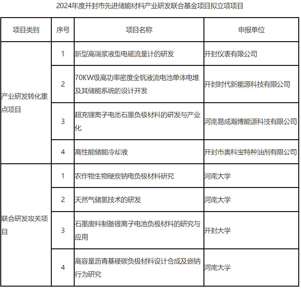 2024年度开封市先进储能材料联合基金项目拟立项项目公示