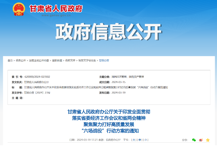 国际能源网获悉,3月19日,甘肃省人民政府发布《甘肃省人民政府办公厅关于印发全面贯彻落实省委经济工作会议和省两会精神聚焦聚力打好高质量发展“六场战役”行动方案的通知》。