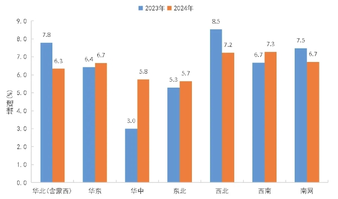 华东、华北、南方电网区域是用电增长主要拉动区域。2024年,预计华北(含蒙西)、华东、华中、东北、西北、西南、南方电网区域全社会用电量比上年分别增长6.3%、6.7%、5.8%、5.7%、7.2%、7.3%、6.7%,西南电网区域用电增速最高。预计华东、华北(含蒙西)、南方电网区域是拉动用电增长的主要区域,合计贡献率超过65%。