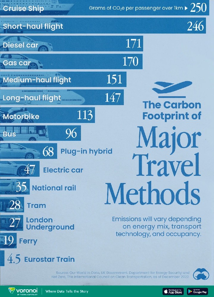 根据这些估计,乘坐游轮、国内飞行和独自驾驶是碳密集度最高的旅行方式。游轮通常使用高碳含量的重质燃油。游轮的平均重量在70000至180000公吨之间,这意味着它们需要大型发动机才能移动。这些大型船只还必须为船上的照明、空调和娱乐系统等设施发电。短途飞行也被认为是碳密集型的,因为相对于较低的巡航量,在初始起飞和爬升高度期间消耗了大量的燃料。