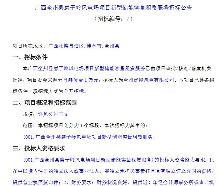 3月11日,广西全州县磨子岭风电场项目新型储能容量租赁服务招标公告发布,招标人为全州优能风电有限公司,项目位于广西桂林市全州县。
