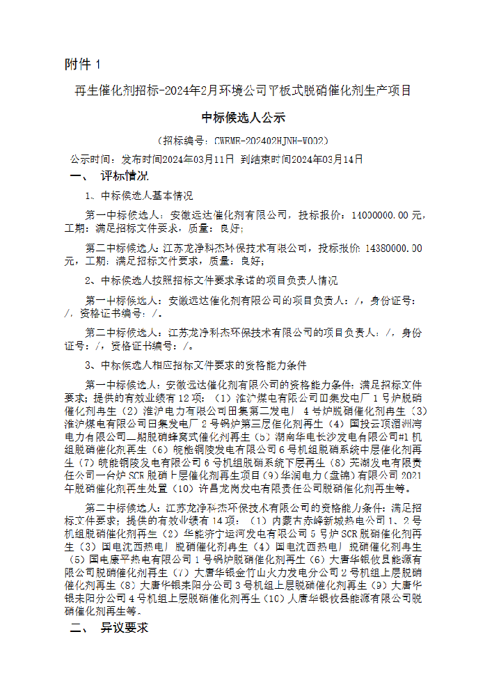 大唐电子商务平台发布大唐南京环保科技有限责任公司再生催化剂招标中标候选人公示,安徽远达催化剂有限公司预中标,报价1400万元。