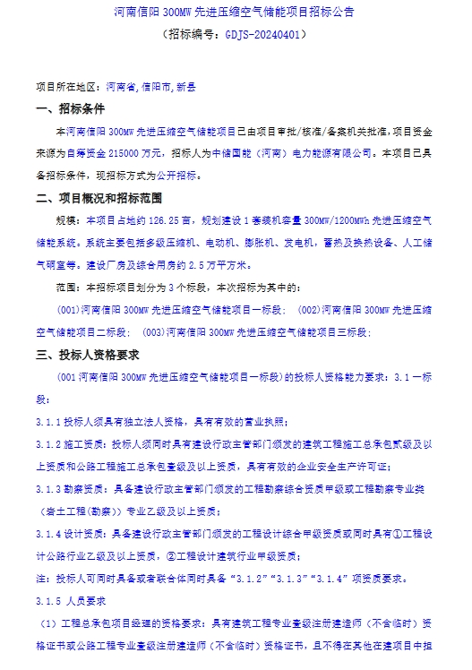 北极星储能网获悉,4月4日,河南信阳300MW先进压缩空气储能项目招标公告发布。本项目占地约 126.25 亩,规划建设1套装机容量 300MW/1200MWh 先进压缩空气储能系统。系统主要包括多级压缩机、电动机、膨胀机、发电机,热及换热设备、人工储气硐室等。建设厂房及综合用房约2.5万平方米。