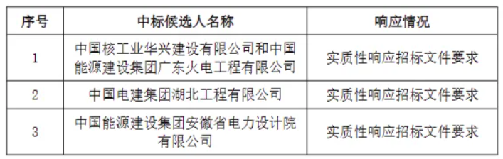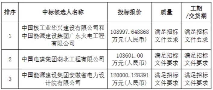 第一中标候选人:中国核工业华兴建设有限公司和中国能源建设集团广东火电工程有限公司,投标报价108997.648868万元,折合单价约为:1.090元/Wh。