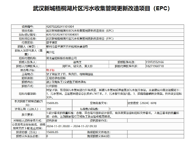 11月1日,武汉新城梧桐湖片区污水收集管网更新改造项目(EPC)招标公告发布。
