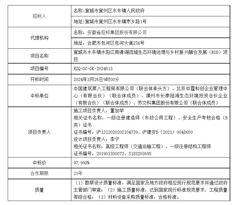 宣城市水东镇水阳江南漪湖流域生态环境治理与乡村振兴融合发展(EOD)项目中标结果公示,中标供应商为中国建筑第八工程局有限公司(联合体牵头方)、北京中霆和创企业管理中心(有限合伙)(联合体成员)、漳州市长泰陆海生态环境投资合伙企业(有限合伙)(联合体成员)、苏交科集团股份有限公司(联合体成员),中标费率97.998%。