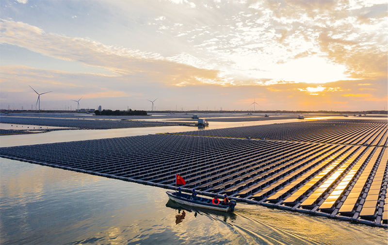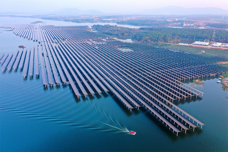 国网江西电力员工巡检水田乡“渔光互补”光伏发电项目。
