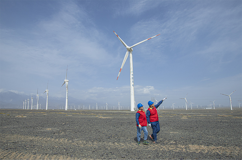 公司员工在达坂城风电场进行用电检查,保障清洁能源安全上网。