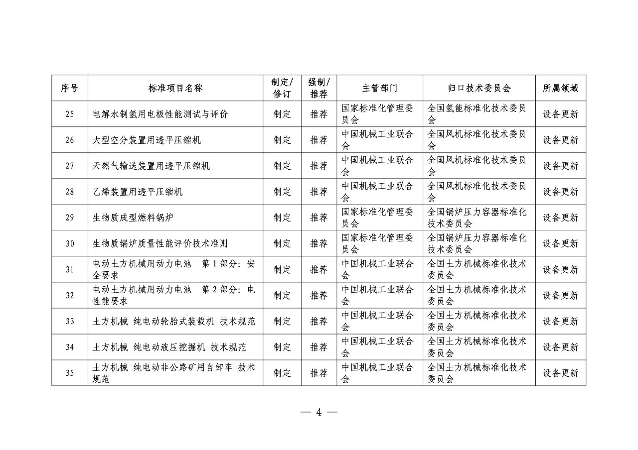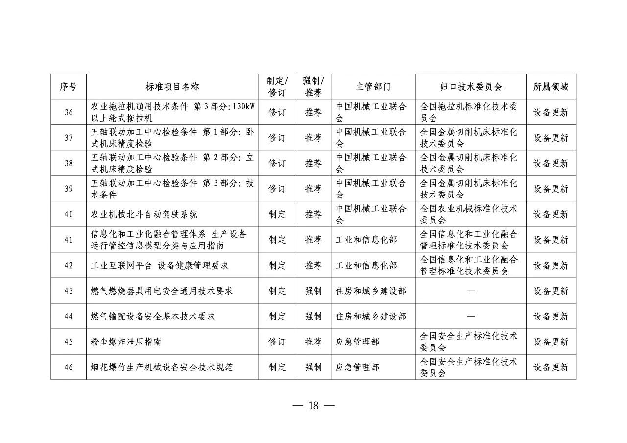 (四)提升设备技术标准水平。研制大规格、高精度、高复杂度数控机床标准,编制工业母机产业链高质量标准体系建设图谱。健全高速鼓风机、生物质锅炉标准,提高通用生产设备的效率和可靠性。制修订高压输电设备、低压配电设备标准,支撑新型电力系统绿色发展。完善农机标准体系,重点攻关大马力拖拉机、大型联合收割机和小型农机标准,满足大规模土地集中流转和丘陵山区作业需求。制定挖掘机、装载机、自卸车等工程机械电动化标准,制修订天然橡胶初加工设备标准,推进农机等领域制定北斗高精度应用标准,制定工业设备数字化管理等标准,提升设备的高端化、智能化、绿色化水平。(国家发展改革委、工业和信息化部、农业农村部、市场监管总局、国家能源局等按职责分工负责)