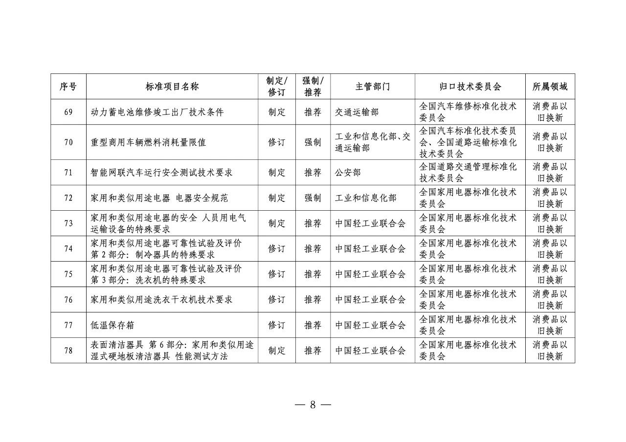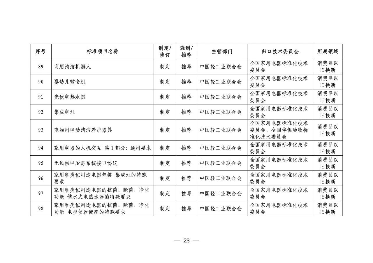 (七)加快家电标准更新换代。制修订传统家电产品质量安全强制性标准,修订安全使用年限推荐性标准,研制集成家电、母婴家电、宠物家电、直流家电、低噪声家电标准,制定人机交互、纳米材料、直流技术等信息技术新材料与家电融合标准,推动绿色智能家电标准体系优化升级,创造家电消费新需求。(国家发展改革委、工业和信息化部、商务部、市场监管总局等按职责分工负责)