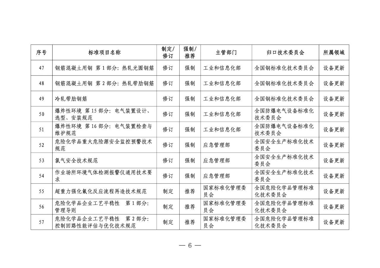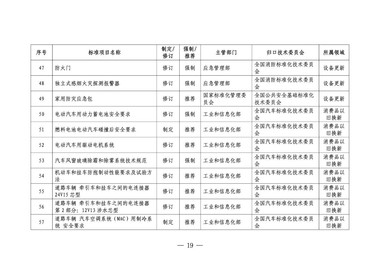 (五)筑牢安全生产标准底线。推动燃气软管、切断阀等燃气用具推荐性标准转为强制性标准,加快防爆电气、钢丝绳等重点产品安全标准升级,完善矿山、危险化学品、烟花爆竹等高风险行业安全标准,修订火灾探测报警、防火分隔、自动灭火设备等消防产品标准,建立健全适应“大安全、大应急”要求的应急避难场所标准体系,制修订家用应急包等产品标准,加强家庭应急产品标准体系建设,有力保障人民群众生命财产安全。(工业和信息化部、住房城乡建设部、应急管理部、市场监管总局、国家矿山安监局、国家消防救援局等按职责分工负责)