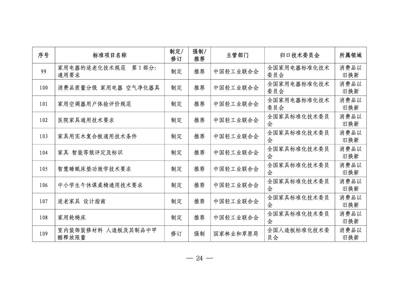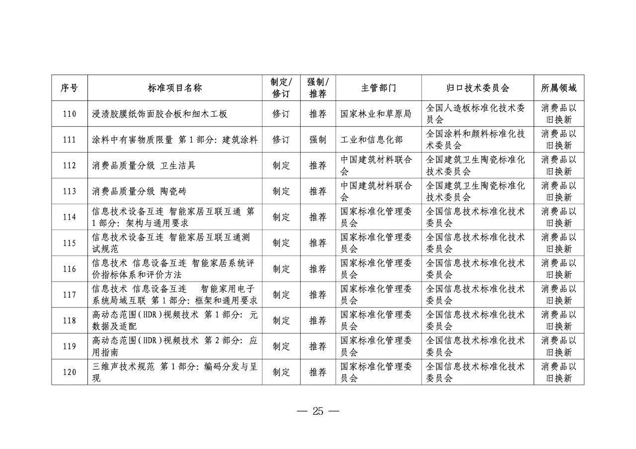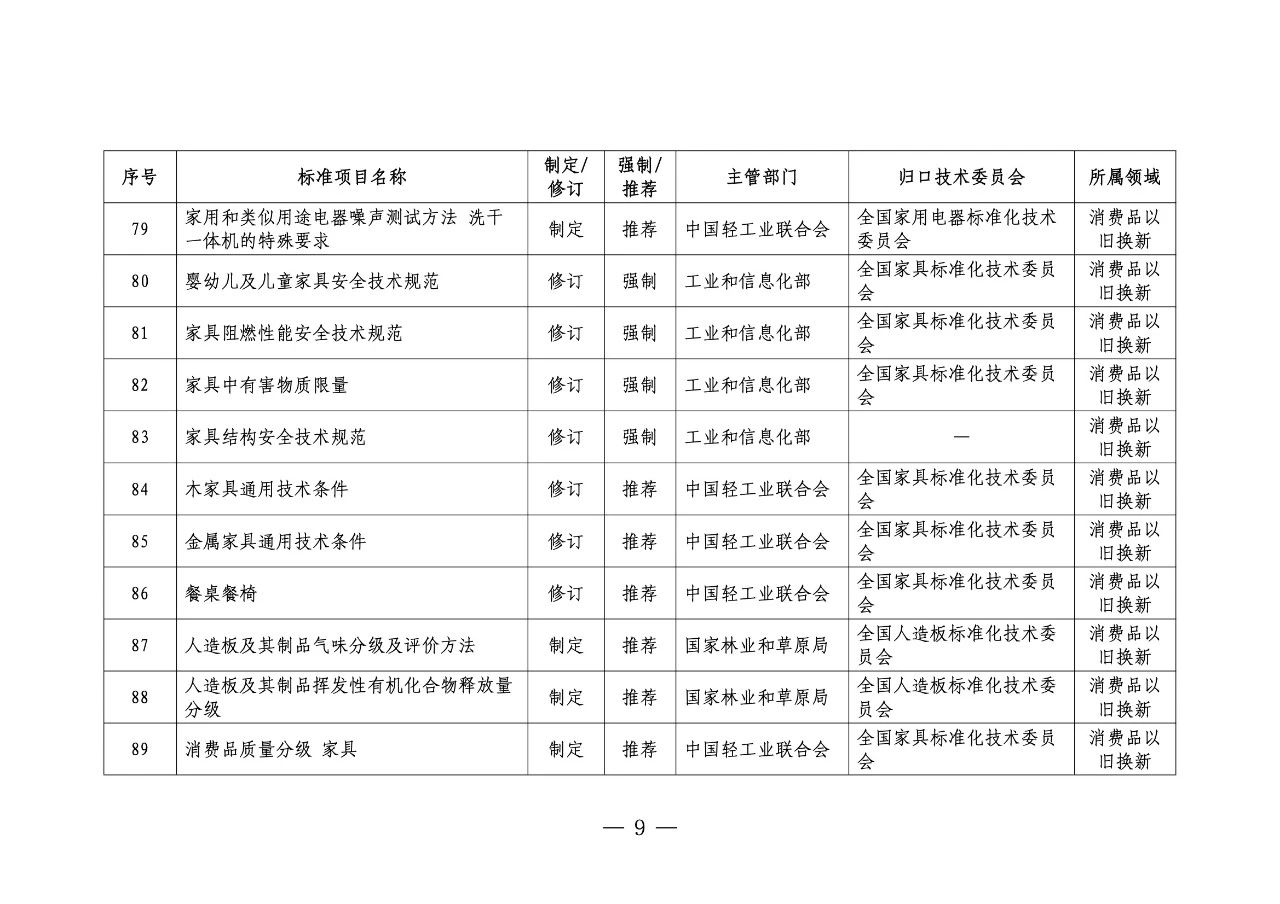 (八)强化家居产品标准引领。加快升级家具结构安全、阻燃性能等强制性标准,完善含挥发性有机物(VOCs)相关产品标准,加严人造板甲醛释放量指标,提升建筑涂料、木质地板等装饰装修产品标准,制修订绿色建材评价标准,制定厨卫五金、卫生洁具、陶瓷砖等质量分级标准,研制智能家居互联互通、风险识别标准,助力提升家居产品消费档次。(工业和信息化部、住房城乡建设部、市场监管总局、国家林草局等按职责分工负责)