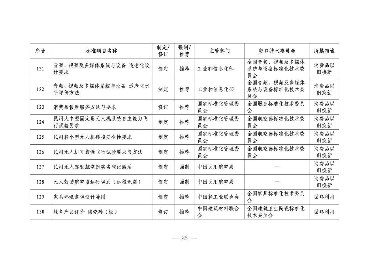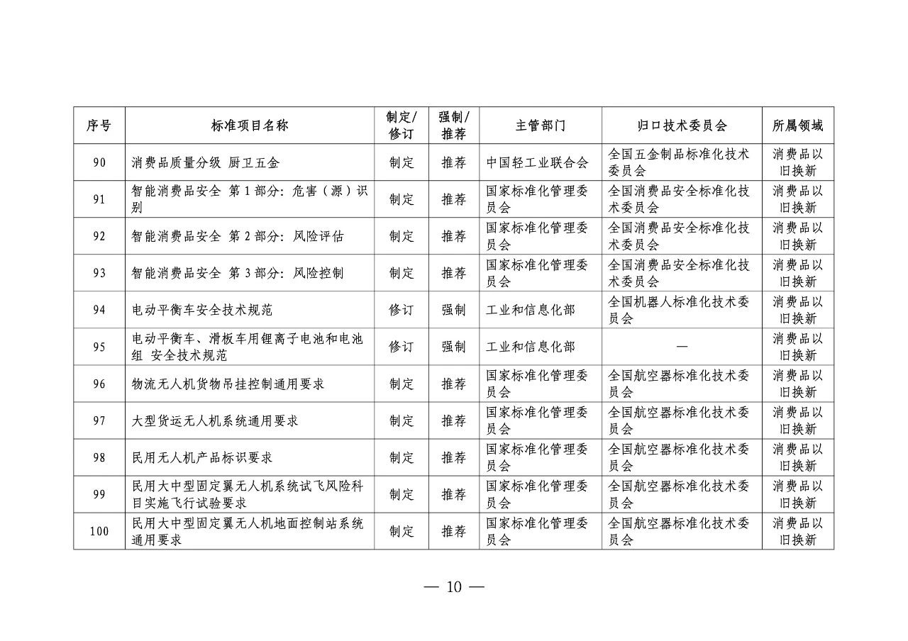 (九)加大新兴消费标准供给。加快构建新一代视听产品及应用标准体系,研制高动态范围(HDR)视频、三维声音技术、超高清视频等高端消费电子产品技术标准,提升用户消费体验。开展无人机飞行试验、物流无人机、无人机适航等标准制定,发展低空经济。(工业和信息化部、市场监管总局、中国民航局等按职责分工负责)