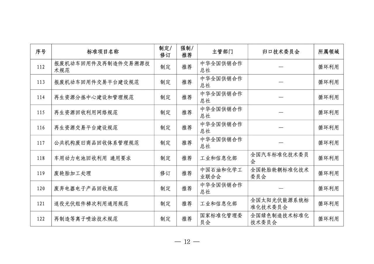 (十二)健全废旧产品回收利用标准。整合优化再生资源回收利用标准体系,研究制定回收站点、分拣中心、交易平台等通用标准,加快健全家用电器、汽车轮胎、纺织服装、家具、农机等产品回收、分拣、拆解、再生利用标准,制定废弃电器电子产品回收规范,不断提升废旧产品回收利用水平。健全完善新能源汽车电池回收利用标准,研制退役风电、光伏设备的绿色拆解和回收利用标准。加强重型机械等再制造标准研究,加快完善重要设备装备的再制造标准体系。(国家发展改革委、工业和信息化部、生态环境部、商务部、市场监管总局、供销合作总社等按职责分工负责)