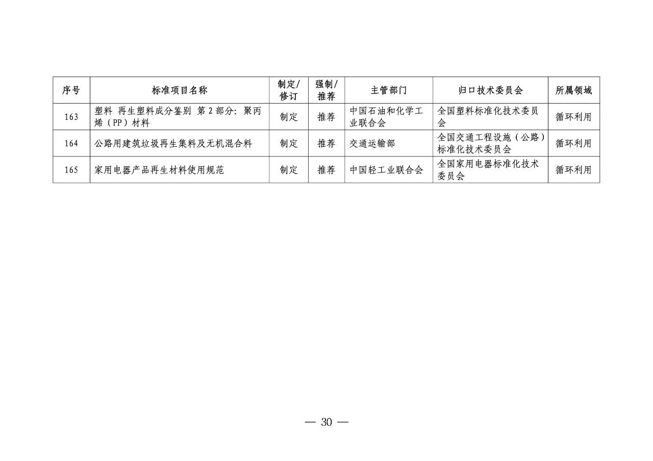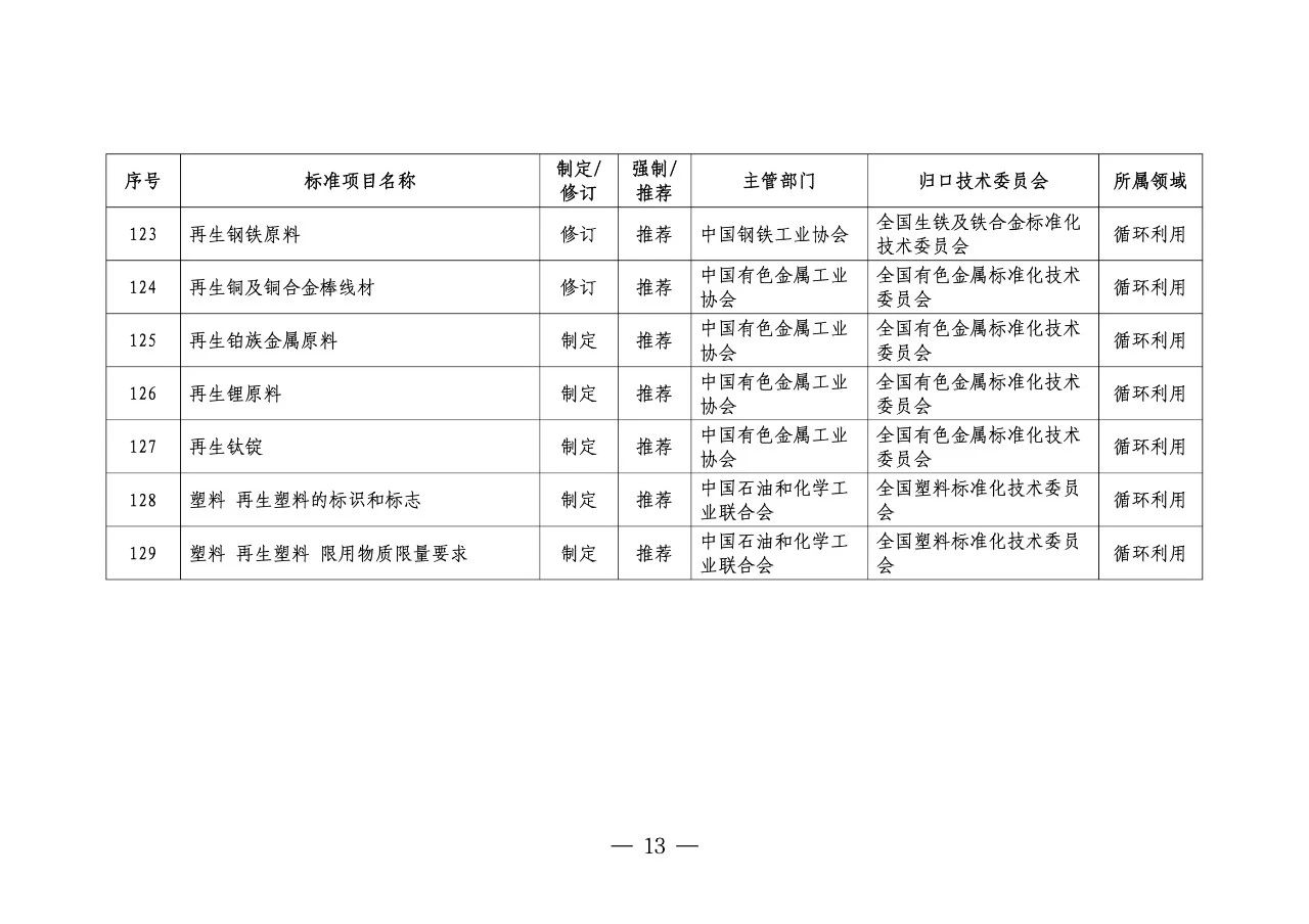 (十三)完善再生材料质量和使用标准。制修订再生金属、再生塑料等再生料质量标准,统筹推进再生塑料全链条标准体系建设,推动建立再生塑料认证体系。探索在家电、汽车、电子产品标准中增加再生塑料、再生金属的使用要求,助力材料使用形成闭环。完善再生资源进口的标准和政策,尽可能多地扩大进口种类和规模。(国家发展改革委、工业和信息化部、生态环境部、交通运输部、海关总署、市场监管总局等按职责分工负责)