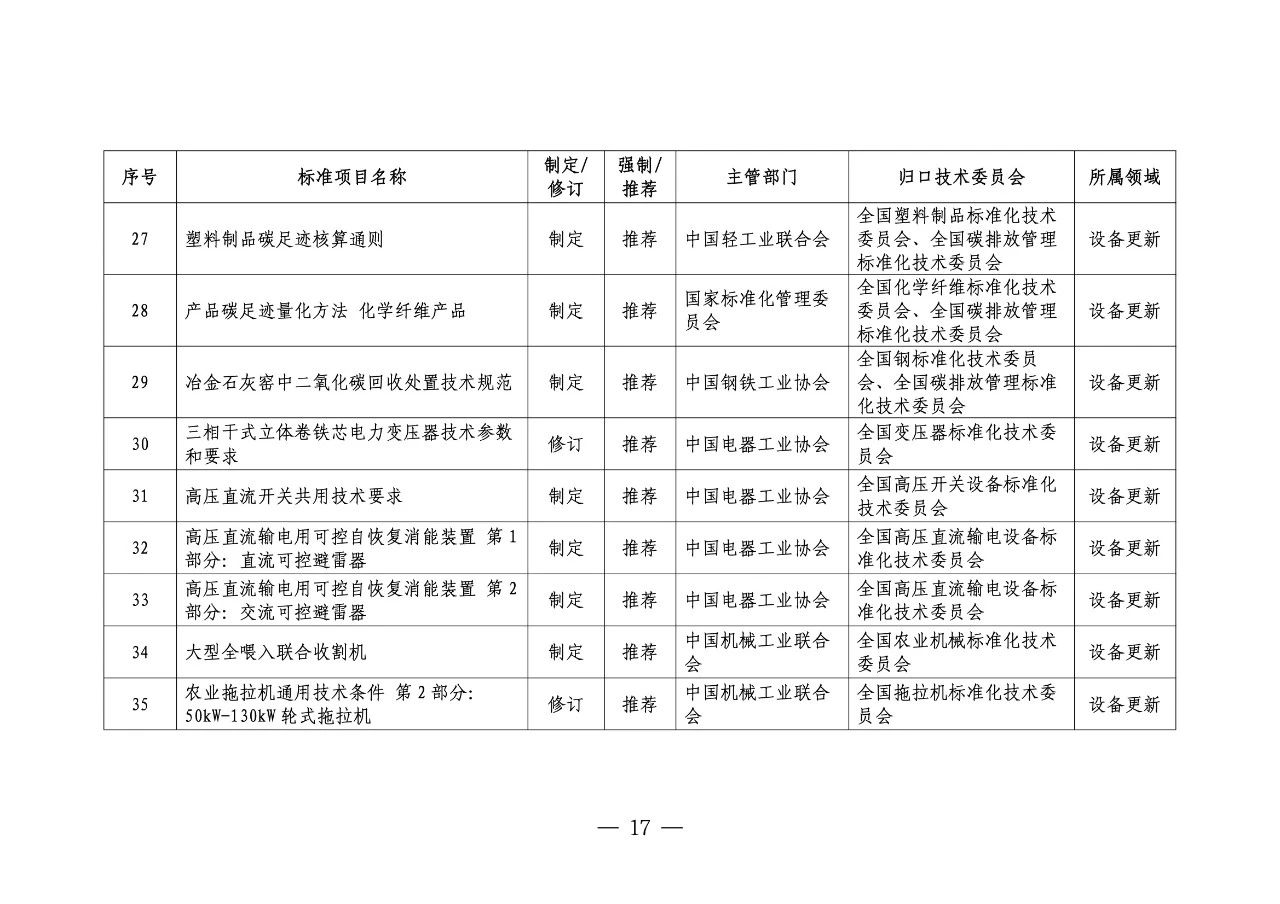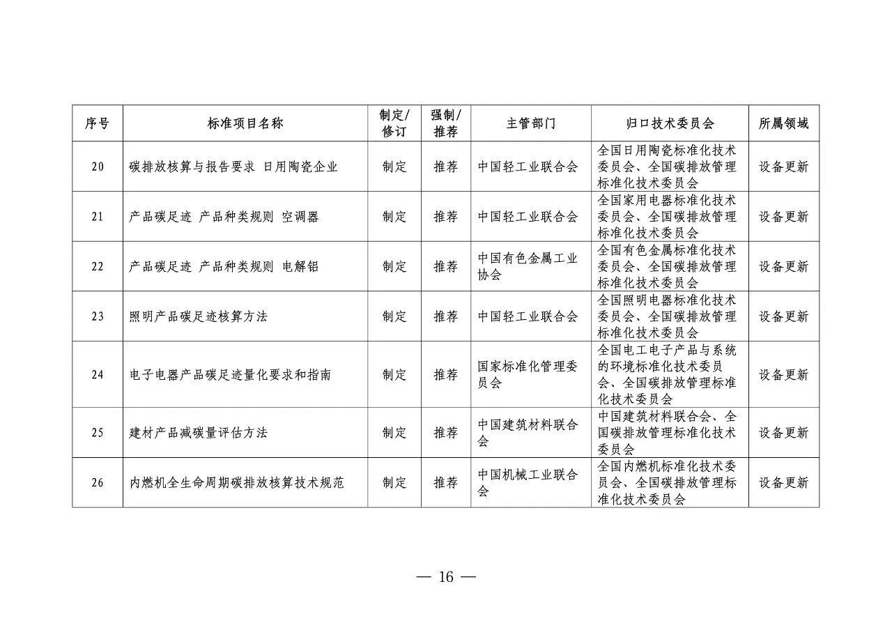 (三)加强低碳技术标准攻关。衔接碳市场建设需求,加快制定有色、建材、化工、轻工等企业碳排放核算标准,尽快实现重点行业碳排放核算全覆盖。发布产品碳足迹量化要求国家标准,统一具体产品的碳足迹核算原则、方法和数据质量,制定碳标签、重点产品碳足迹标准。推动碳减排和碳清除技术标准制定,加快出台碳捕集利用与封存标准,助力产业低碳转型。(国家发展改革委、工业和信息化部、生态环境部、农业农村部、市场监管总局、国家能源局等按职责分工负责)