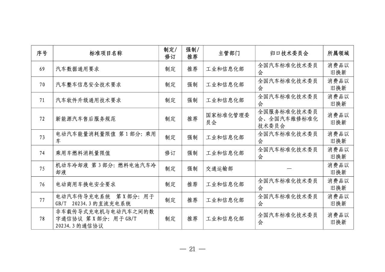 (六)推动汽车标准转型升级。修订电动汽车动力电池安全标准,加大新能源汽车整车安全、充换电标准供给,加强自动驾驶、激光雷达等智能网联技术标准研制,加快先进技术融合迭代,提升网络安全等级和数据安全保护水平。完善汽车售后服务及维修标准,营造有利于新能源汽车发展的消费环境。加快乘用车、重型商用车等能源消耗量限值标准升级。(国家发展改革委、工业和信息化部、公安部、住房城乡建设部、交通运输部、市场监管总局、国家能源局等按职责分工负责)