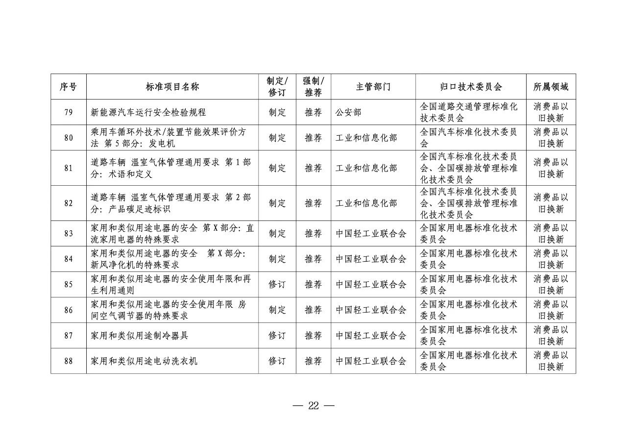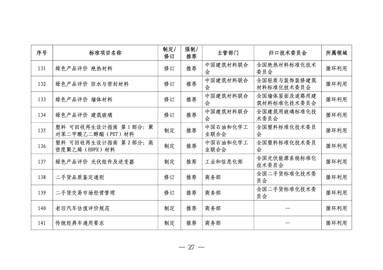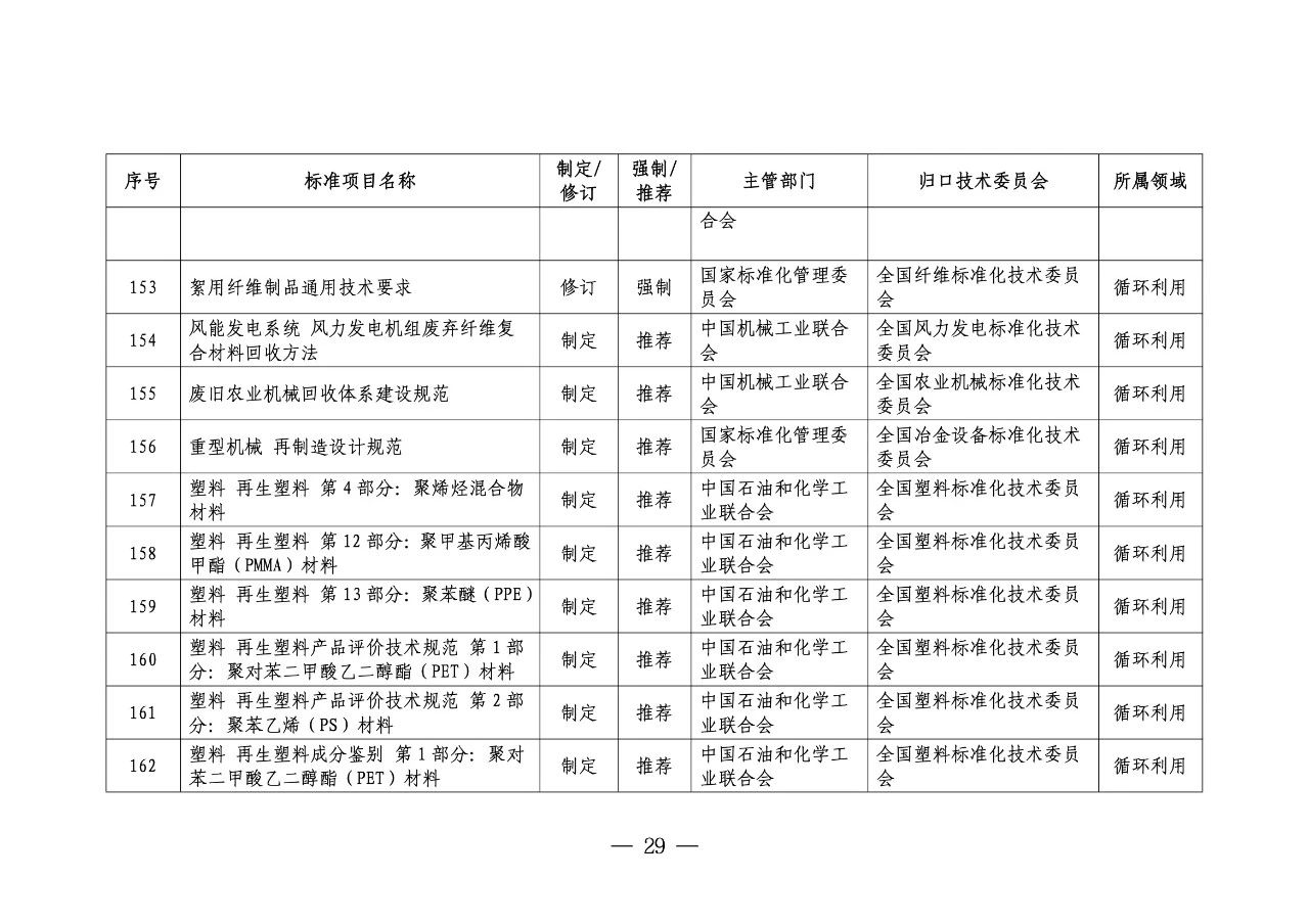 (十)推进绿色设计标准建设。加强家电、家具、电子产品、纺织服装、塑料等产品绿色设计标准研制,将材料可再生利用率指标纳入家用电器强制性标准,引导产品设计充分考虑材料的易回收、易拆解、易再生。制定风电和光伏设备绿色设计标准,将设备及零部件可回收、可循环利用作为评价的重要内容。(工业和信息化部、市场监管总局等按职责分工负责)