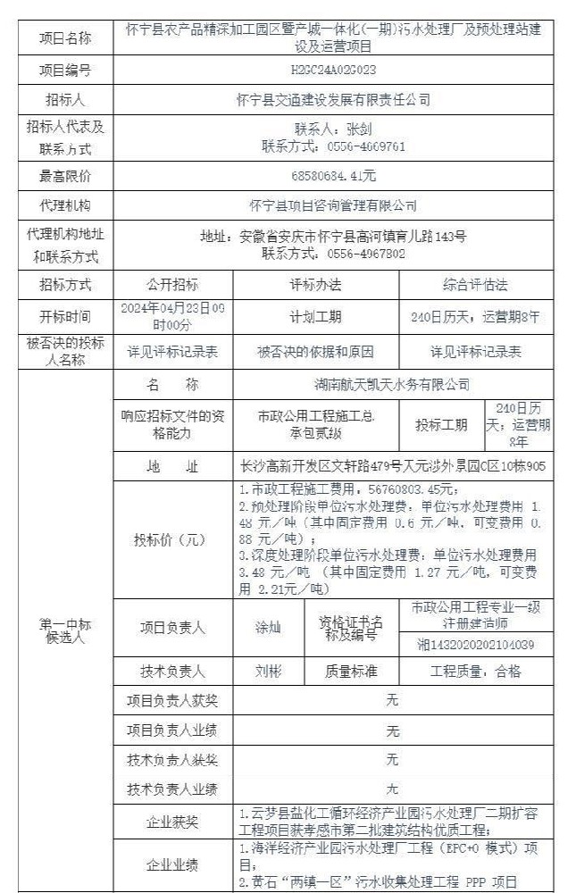 4月24日,安徽怀宁县农产品精深加工园区暨产城一体化(一期)污水处理厂及预处理站建设及运营项目中标候选人公示,第一中标候选人湖南航天凯天水务有限公司,投标工期:240日历天;运营期8年。招标人怀宁县交通建设发展有限责任公司。