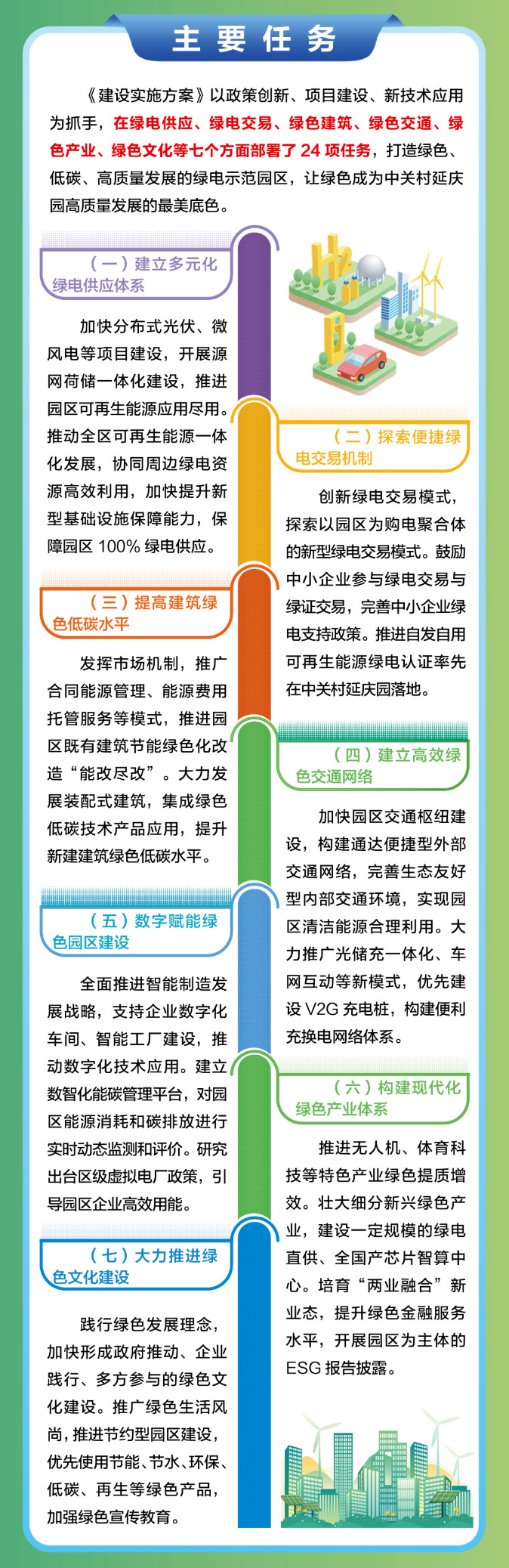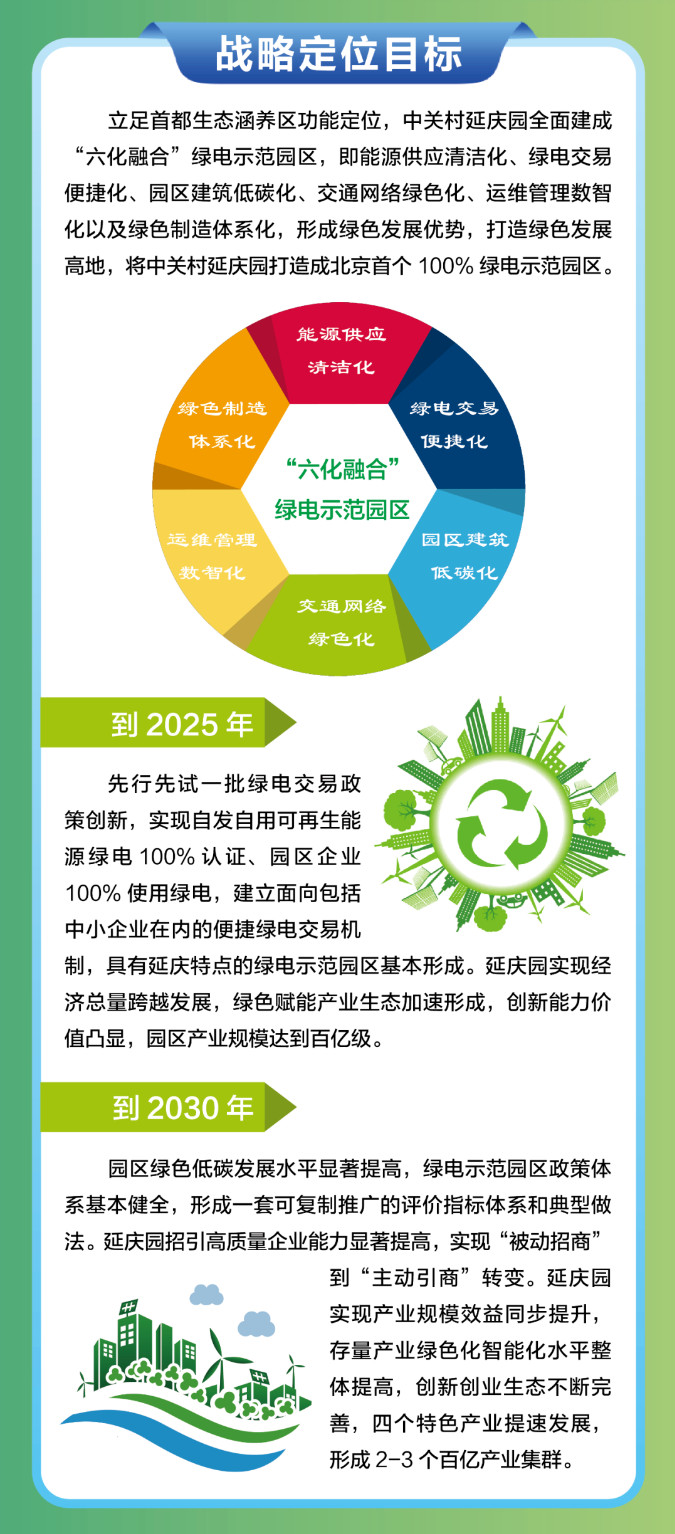 到2025年,中关村延庆园绿电示范园区基本建成,实现园区自发自用可再生能源绿电100%认证、园区企业100%使用绿电;到2030年,绿电示范园区政策体系基本健全,形成一套可复制推广的评价指标体系和典型做法,产业绿色化智能化水平整体提高。