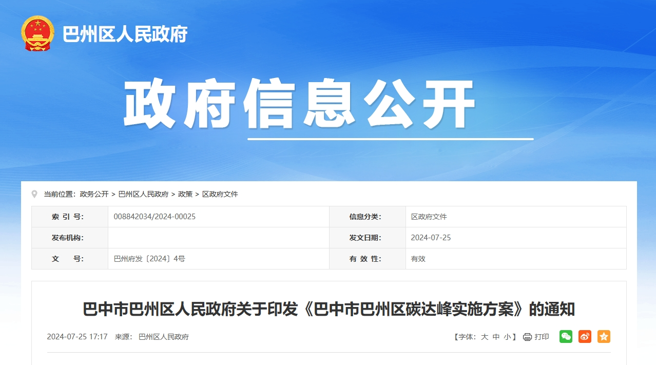 7月25日,四川巴中市巴州区人民政府关于印发《巴中市巴州区碳达峰实施方案》(以下简称《方案》)的通知。