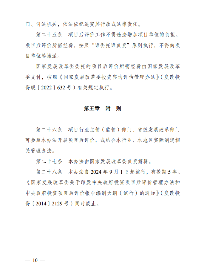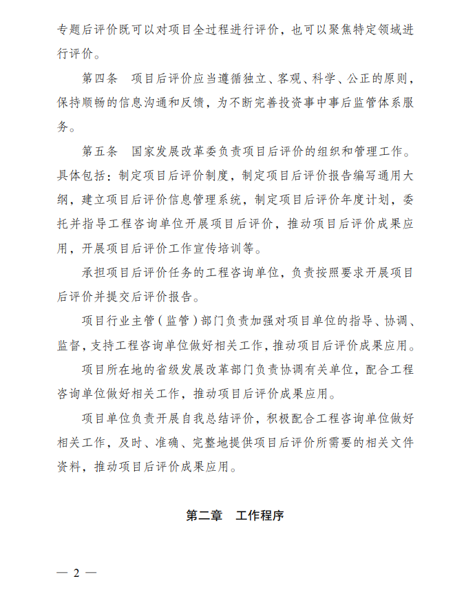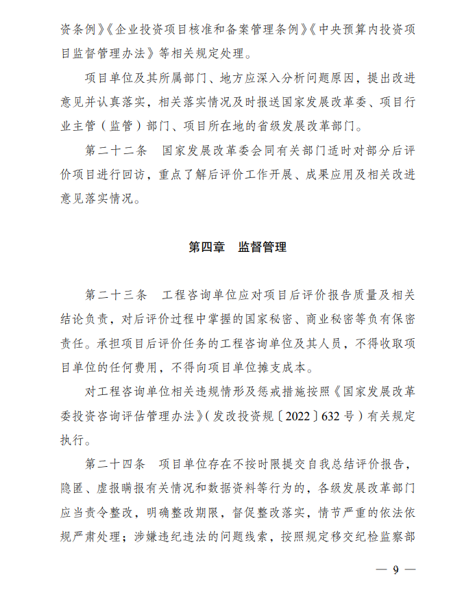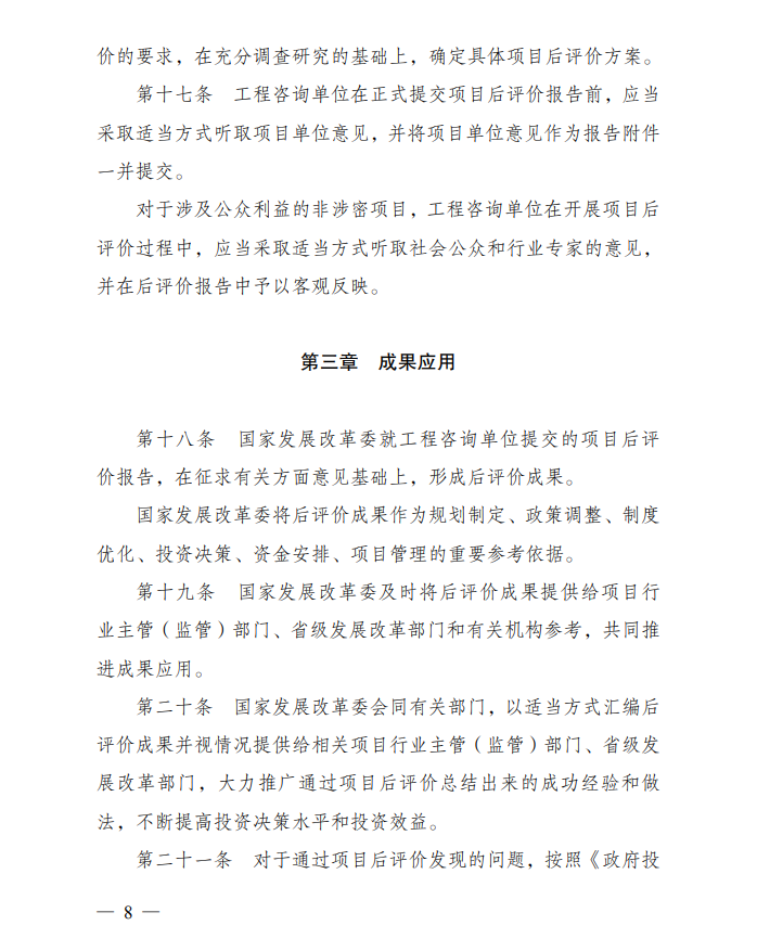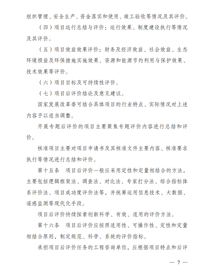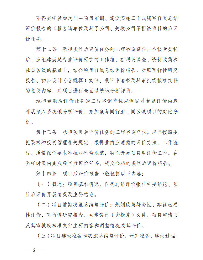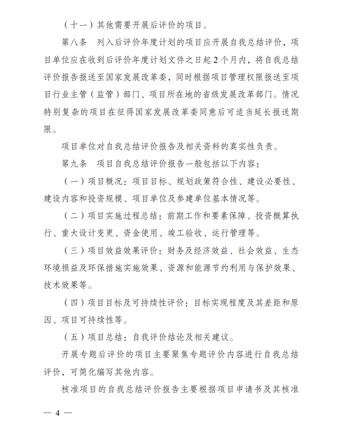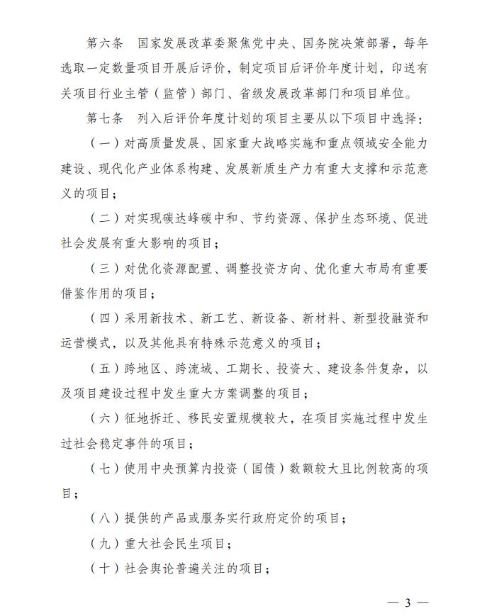 《办法》明确:国家发展改革委聚焦党中央、国务院决策部署,每年选取一定数量项目开展后评价,制定项目后评价年度计划,印送有关项目行业主管(监管)部门、省级发展改革部门和项目单位。列入后评价年度计划的项目包括对实现碳达峰碳中和、节约资源、保护生态环境、促进社会发展有重大影响的项目等。