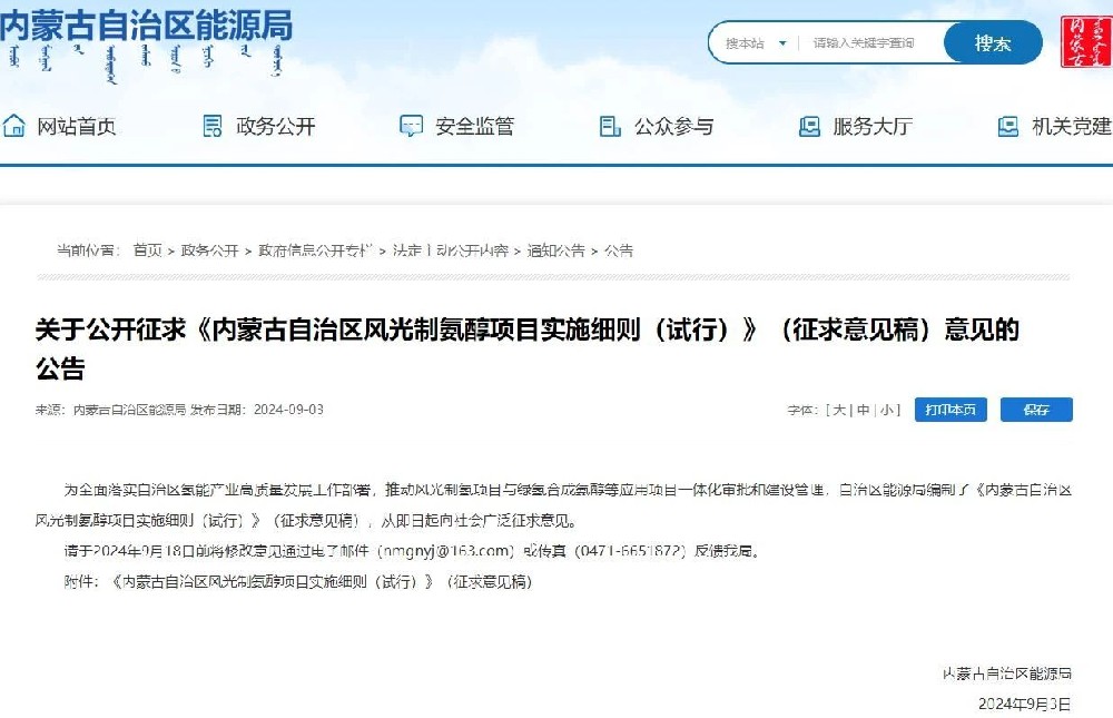 9月3日,内蒙古自治区能源局发布《内蒙古自治区风光制氨醇项目实施细则(试行)》(征求意见稿),并向社会广泛征求意见。