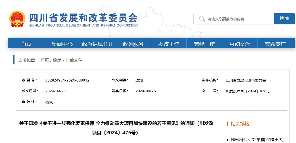 关于印发《关于进一步强化要素保障 全力推动重大项目加快建设的若干意见》的通知(川发改项目〔2024〕476号)