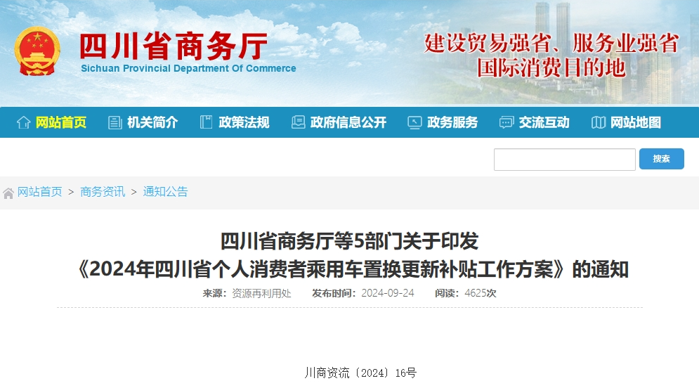 9月24日,四川省商务厅等5部门关于印发《2024年四川省个人消费者乘用车置换更新补贴工作方案》(以下简称《方案》)的通知。