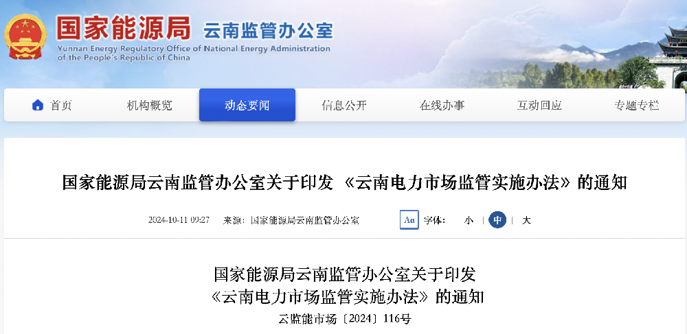 10月11日,国家能源局云南监管办公室发布了关于印发 《云南电力市场监管实施办法》的通知,云南电力市场监管对象为参与省内和跨省跨区电力中长期市场、现货市场、辅助服务市场、容量市场等各类电力市场成员。电力市场成员包括电力交易主体、电力市场运营机构和提供输配电服务的电网企业等。